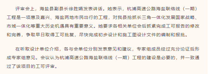 9月17-18日,杭浦高速公路海盐联络线(一期)工程可行性研究报告评审会在我县召开,省市县各相关单位以及特邀专家参加,海盐县副县长徐胜娟出席会议。