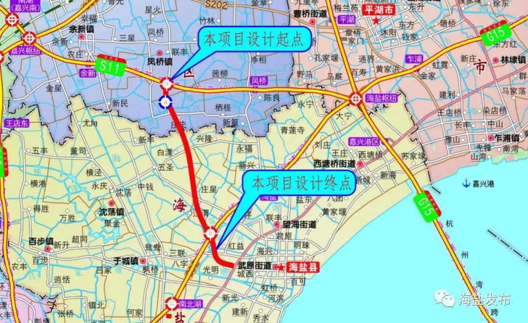 本项目起点位于南湖区凤桥镇,向南延伸至海盐境内,跨越规划海盐大道后偏向东,设置武原枢纽与杭浦高速相交,枢纽距南北湖、海盐互通各约5公里,主线跨越杭浦高速公路、杭平申线III级航道后,路线折向南,设主线收费站后东接枣园西路,与G525相交。