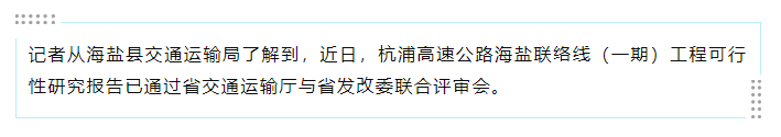 杭浦高速公路海盐联络线(一期)工程已被列入《浙江省综合交通运输发展“十四五”规划》实施类项目,惠及嘉兴、海盐两地市民的出行,项目的建设对完善浙北高速公路网,促进海盐与嘉兴深度融合,推动高质量发展建设共同富裕示范区“半小时交通圈”覆盖率提升,抢抓长三角一体化发展国家战略、市域一体化等重大历史机遇,助力区域经济发展具有重大意义。