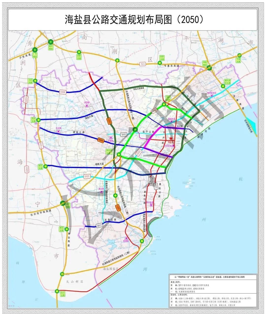 五横:G320 上瑞线、海盐大道+盐北路、S303 湖盐公路、核电大道、武袁公路(秦山-海宁界)
