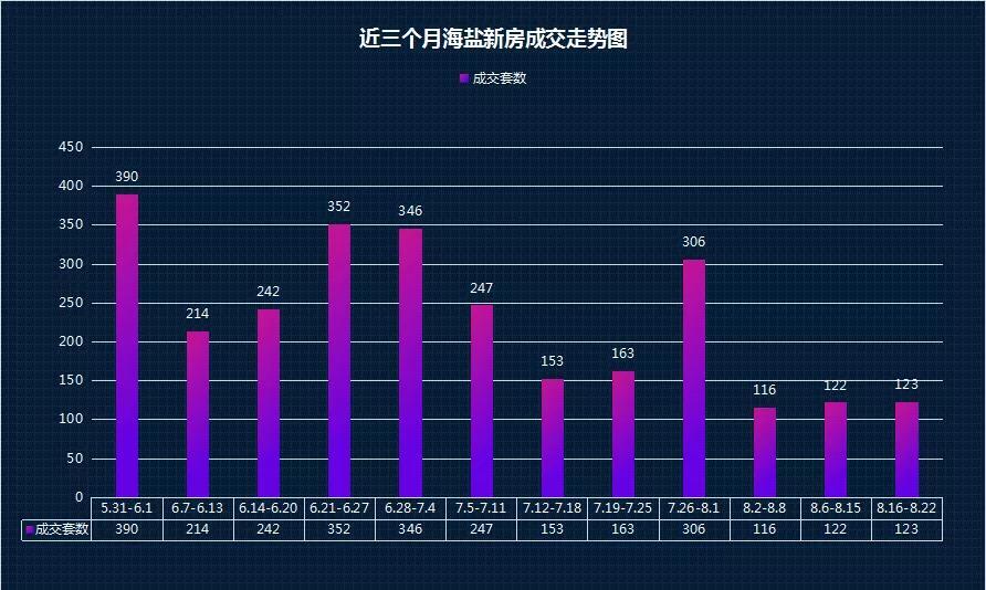 上周(8月16日-8月22日),海盐县一手房商品房 (住宅) 成交共123套,环比上周成交几乎持平;成交面积为12200平方米,成交金额1.37亿元。