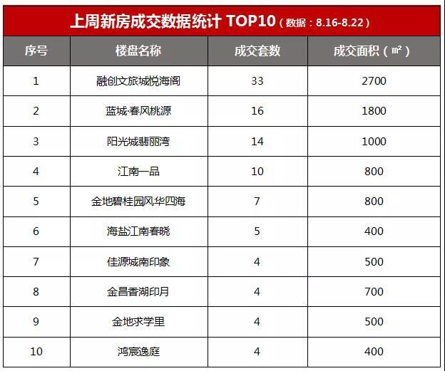 上周共6个楼盘住宅备案量达到5套以上,其中杭州湾融创文旅城悦海阁以33套占据榜首,西塘桥街道的蓝城春风桃源以16套的成交占据第二,同样是来自滨海新城的翡丽湾以14套的成交排名第三。