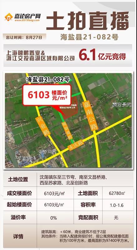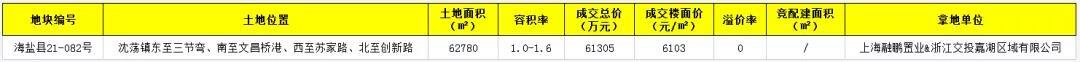 昨日(8月27日)嘉兴海盐沈荡镇出让一宗住宅用地,地块编号为海盐县21-082号,竞拍1轮,以总价61305万元,溢价0%,楼面价6103元/㎡成交,被上海融鹏置业&浙江交投嘉湖区域有限公司摘得。