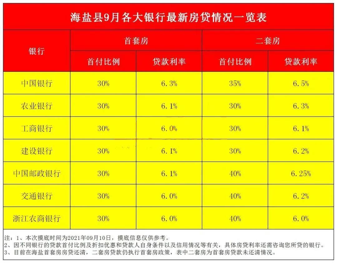 在这7家银行中,海盐首套房最低首付比例均为30%;二套房首付比例不一,部分银行首付比例最低为30%,最高可至40%。
